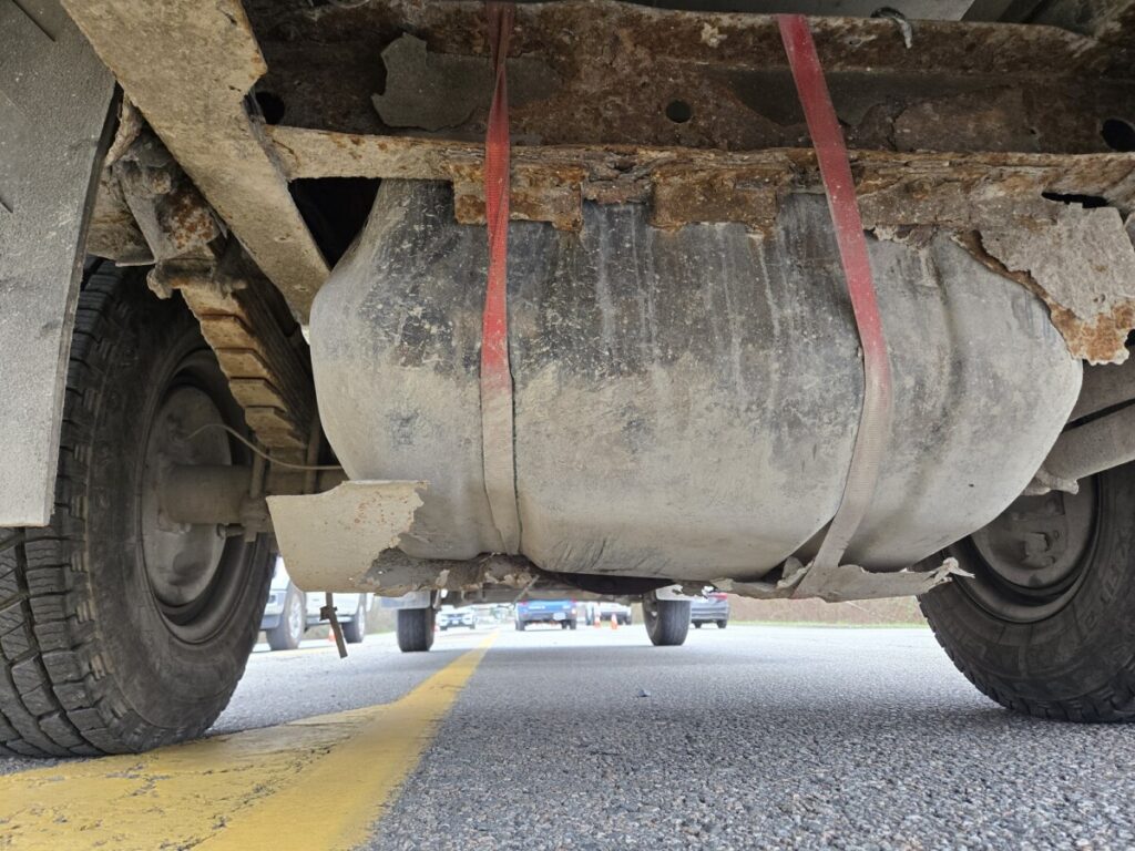 One dump truck pulling a flat deck trailer with a bobcat produced the most violations. The driver had replaced a missing fuel cap with a sandwich bag held on by a phone charging cable. A fuel tank held on by two non-rated straps — one damaged, one cutting into a broken housing — had lost its original mounting entirely. The truck also had a defective steering mechanism. The trailer had an inoperable emergency brake. Repeated overloading had bent the trailer’s axles and wheel housings.