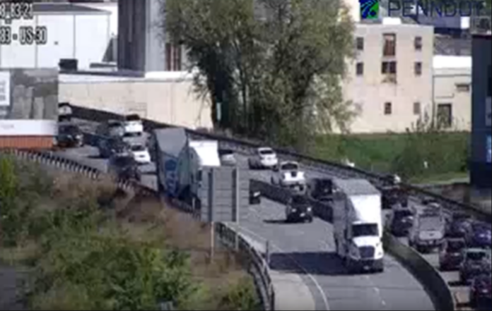 YORK COUNTY, PENNSYLVANIA — A fully loaded tractor-trailer broke in half and folded like a “V” on northbound Interstate 83 near the Route 30 East/Arsenal Road exit in York County Monday afternoon, closing the right lane and shoulder and backing up traffic three to four miles.