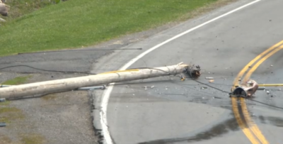 PHELPS, NEW YORK — A tractor-trailer clipped a power line on Waddell Road in Phelps, bringing down a telephone pole and causing fluid from a transformer to leak onto the truck. NYSEG Hazmat and Clifton Springs Fire Department responded to the scene.