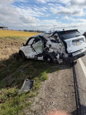 During the chase, a deputy stepped out of his patrol vehicle to deploy stop sticks. The driver, Randall Baker, 41, of Evansville, steered the semi directly toward the deputy. Baker missed the deputy but slammed into the patrol car, causing extensive damage. The semi then left the roadway and came to rest in a field. The deputy was not injured.