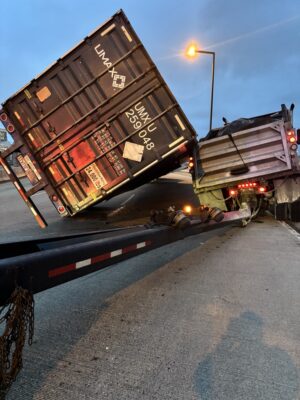 The Washington State Department of Transportation reported the crash at approximately 6 a.m. on April 2. Photos from the scene showed the semi’s trailer tipped over and propped up by the bed of the dump truck beneath it. Initially two right lanes were blocked. All four lanes closed shortly after.