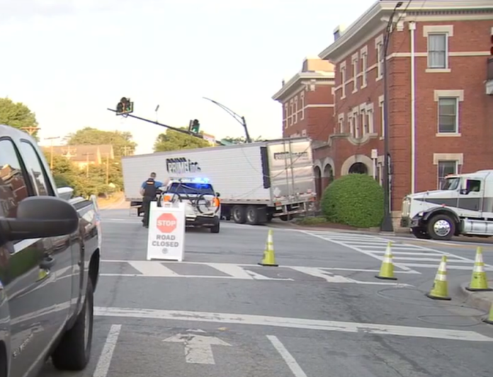 GREENVILLE, SOUTH CAROLINA — A semi-truck crash in downtown Greenville knocked down power lines and damaged streetlights Thursday evening, shutting down roads near North Church Street and East Washington Street and drawing a large response less than a block from several popular businesses.