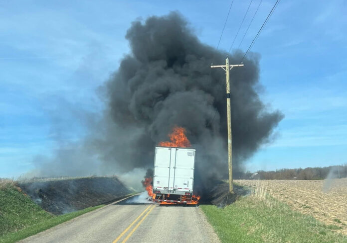 Silver Lake Volunteer Fire Department Chief John Conley said the department received the call at 2:42 p.m. Driver Derek Shea had been experiencing ABS issues with the trailer and pulled off Indiana 14 to wait for a maintenance man. Approximately 30 minutes after parking, while still on the phone with the maintenance man, a tire blew and flames broke out.