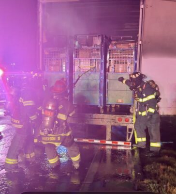 Crews responded at 8:50 p.m. The Truck 11 crew arrived to find flames coming from the rear wheel duals and axle on both the driver and passenger sides. The fire had already burned through the metal exterior of the trailer and ignited boxes inside. Firefighters had water on the fire within two minutes while simultaneously pulling containers out of the trailer. Crews then located the main body of fire and extinguished it. The driver was not injured.